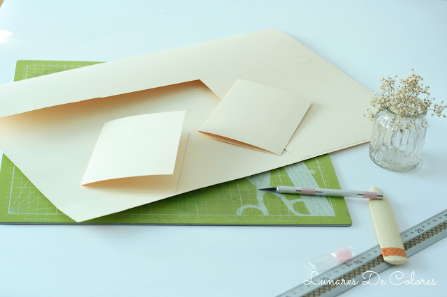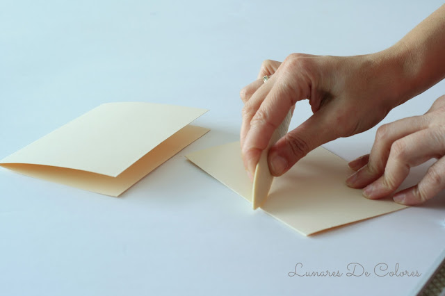 Cortamos dos trozo de la cartulina lisa de color crema, las doblamos a la mitad y obtenemos así las dos bases para nuestras tarjetas.